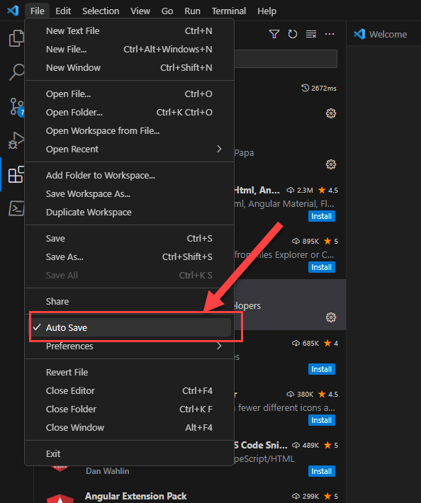 To install autosave select "Auto Save" from the "File" option in the main menu of VS Code. Some people do not like the constent refreshing but we highly recommend you at least try it out.