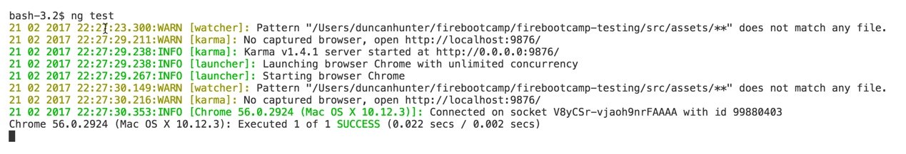 - Karma should still be running from your last test and on save of the spec file automatically re run.